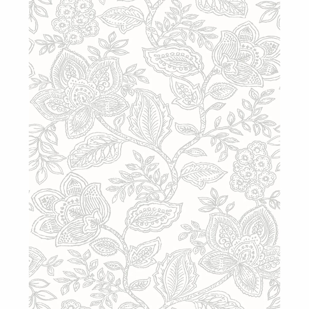 With a grey and white palette, this modern Jacobean floral wallpaper has a bright and clean look. Raised inks will add a dimensional look to walls. Larkin is an unpasted, non woven wallpaper.