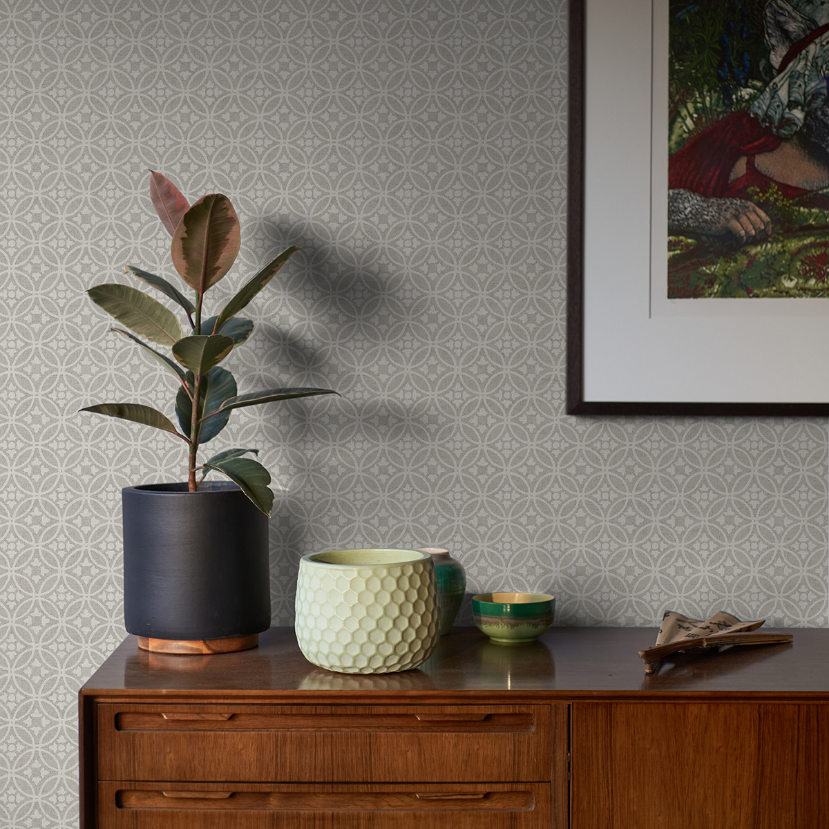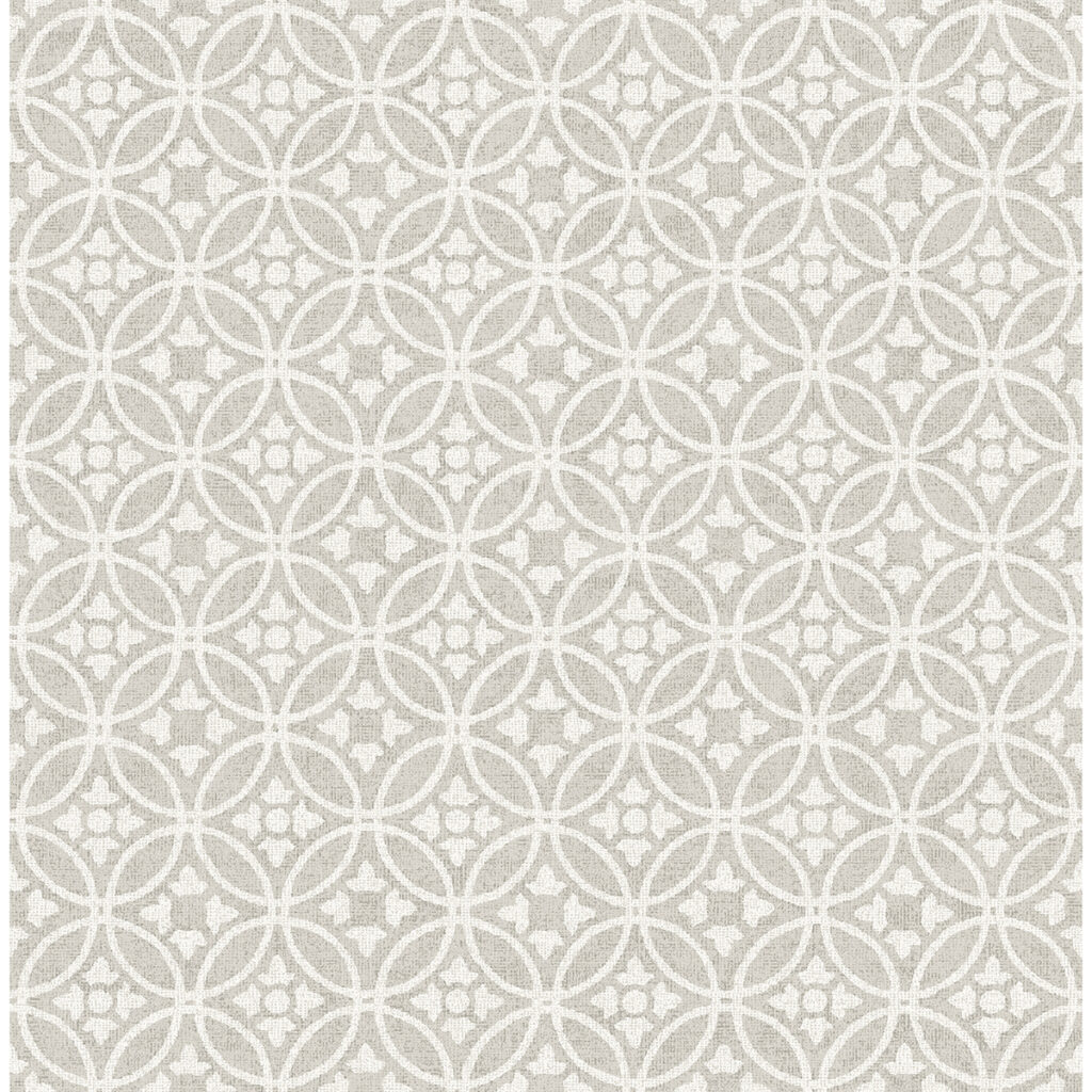 This geometric design is the perfect charming accent for your walls. The white overlapping rings are each accented with a simple floral stamp, all softly accented by the distressed grey backdrop. Larsson is an unpasted, non woven wallpaper.