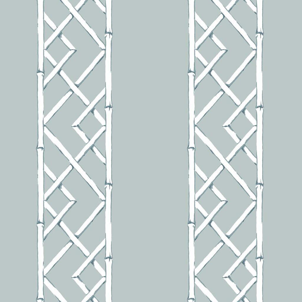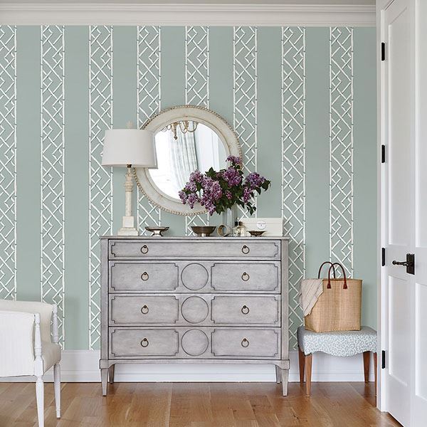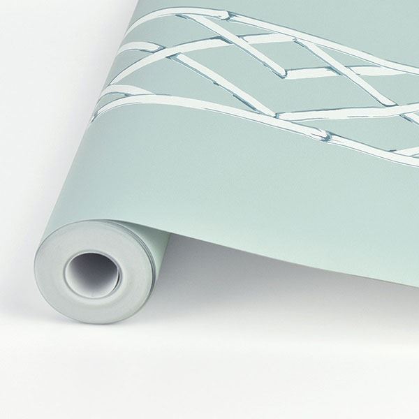 Mica-infused ink accents add flashes of shine to this trellis stripe pattern for a traditional look with contemporary influence. The dusty aqua strikes a perfect balance between vibrant and refined. Latticework is an unpasted, nonwoven wallpaper.