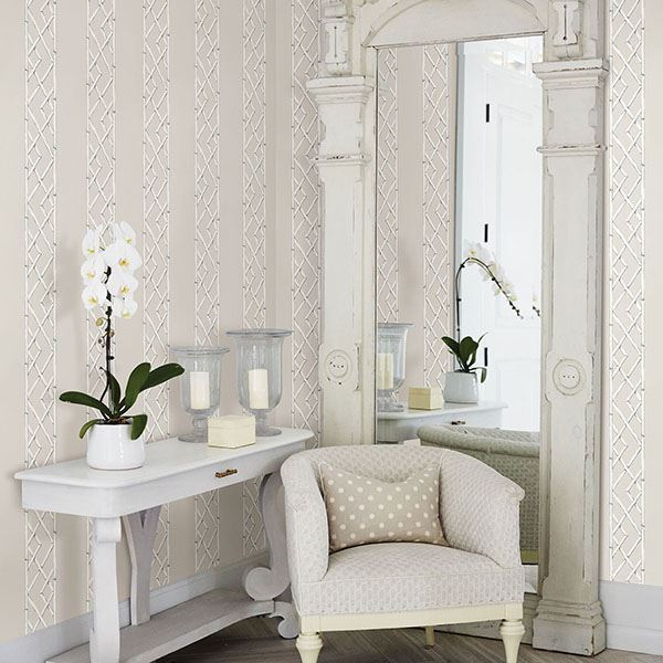 Mica-infused ink accents add flashes of shine to this trellis stripe pattern for a traditional look with contemporary influence. The pale grey and silver design is a chameleon, pairing as well with quiet cool tones as it would with vibrant statement pieces. Latticework is an unpasted, nonwoven wallpaper.