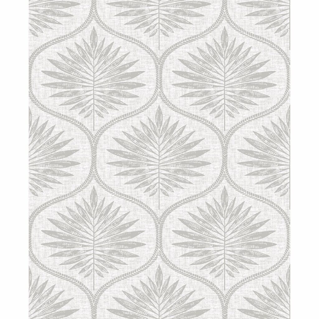 A light grey ogee print curls against a linen inspired background in this Scandinavian wallpaper. Block print leaves lend to its Nordic style. Laurel is an unpasted, non woven wallpaper.