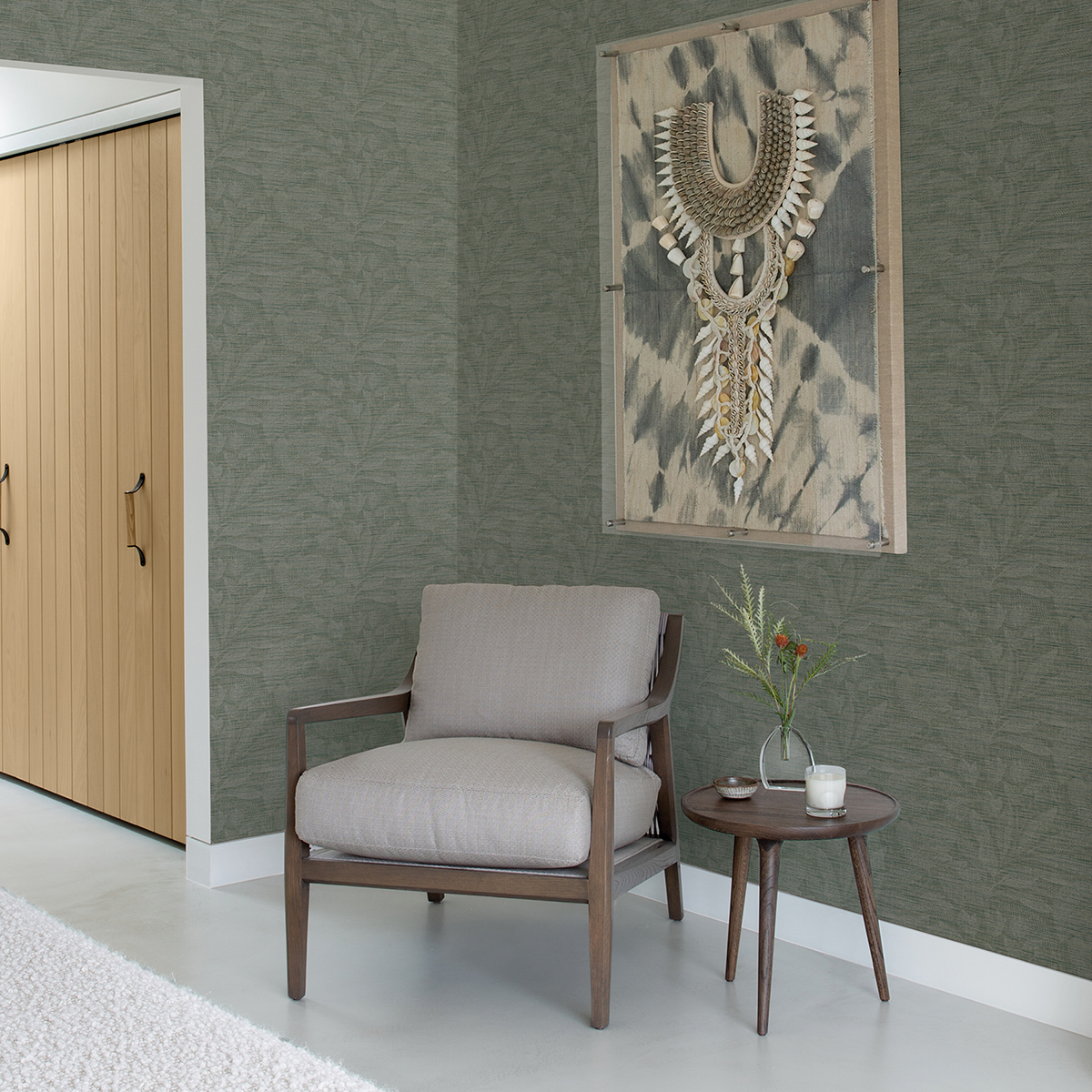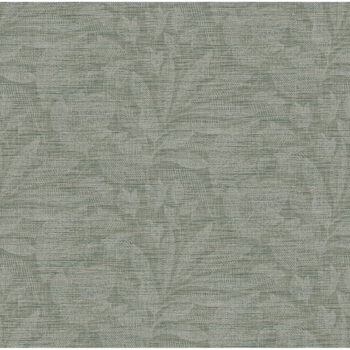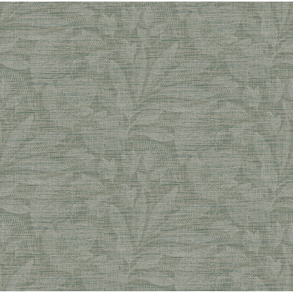 Enjoy earthen sophistication with this contemporary botanical wallpaper. Delicate leaf imprints composed of fine white lines overlay a blend of jade and sage that mimics the look of linen. Lei is an unpasted, non woven backed vinyl wallpaper.