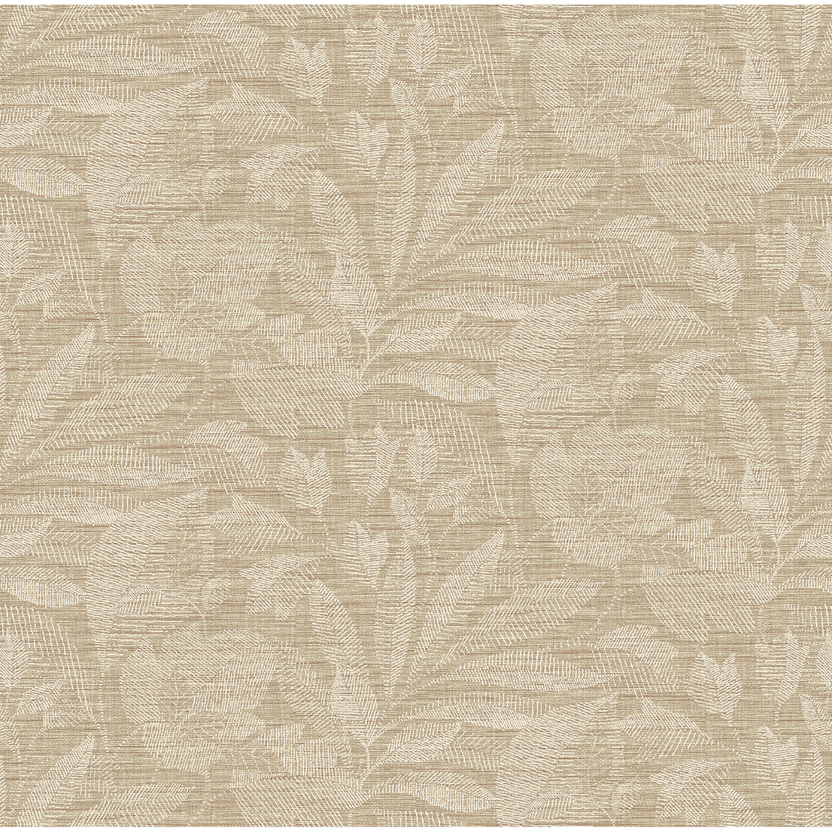 Bring warmth and dimension to your walls with this modern botanical design. Leaves are shaped by dashes of white ink and cover a variegated golden beige faux-fabric backdrop. Lei is an unpasted, non woven backed vinyl wallpaper.