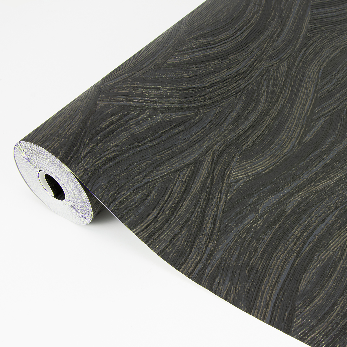 This dramatic yet soothing wallpaper will transform your space into an oasis of calm. The embossed waves unfurl in loose arches, the embossed black base brushed with a pearlescent gold. Leith is an unpasted, non woven backed vinyl wallpaper.