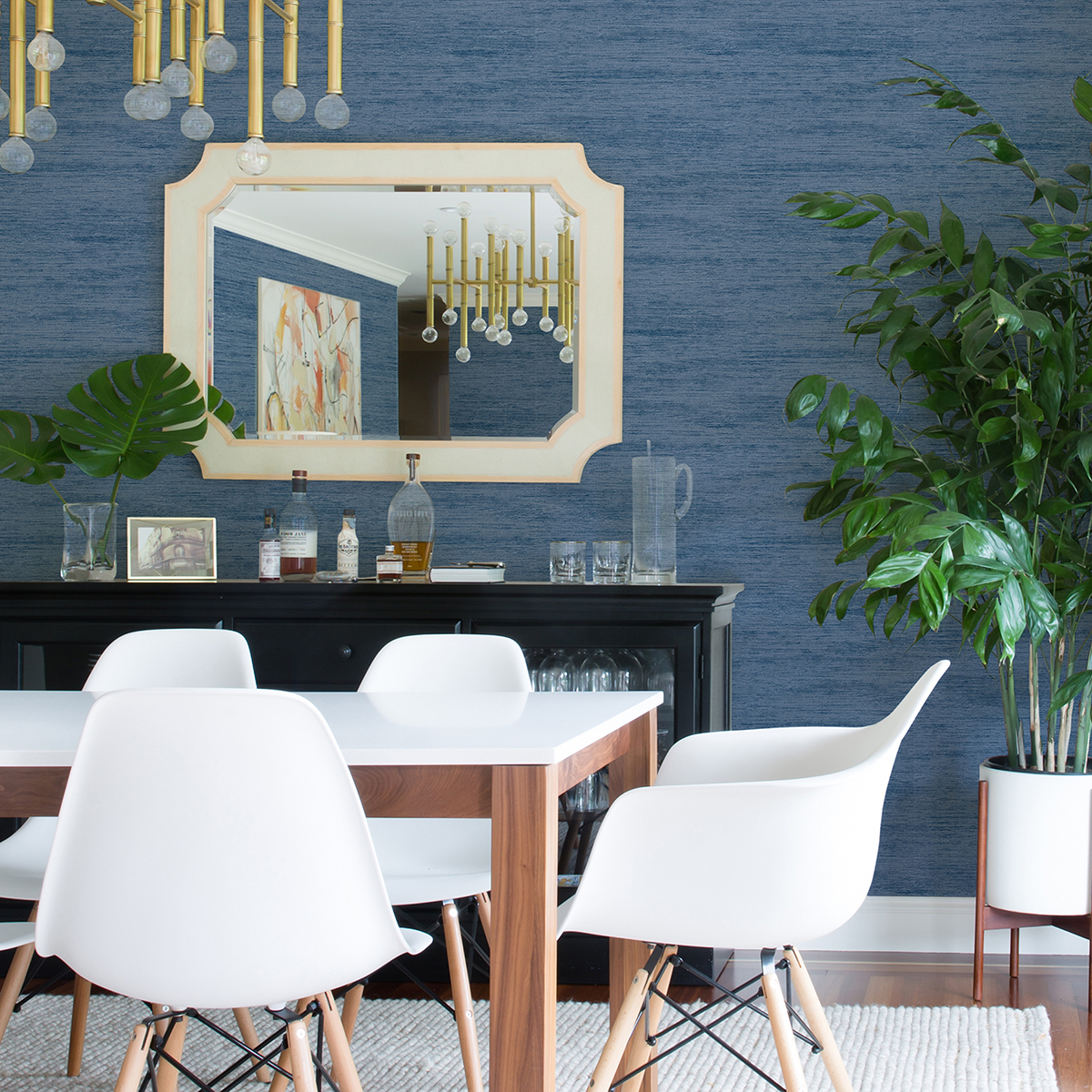 This faux fabric wallpaper brings an air of sophistication to your walls. The charming denim blue is accented by dashes of darker blue and lines of raised inks. Lindsay is an unpasted, non woven backed vinyl wallpaper.