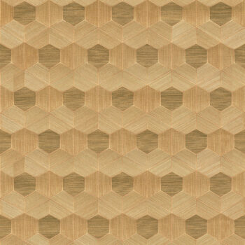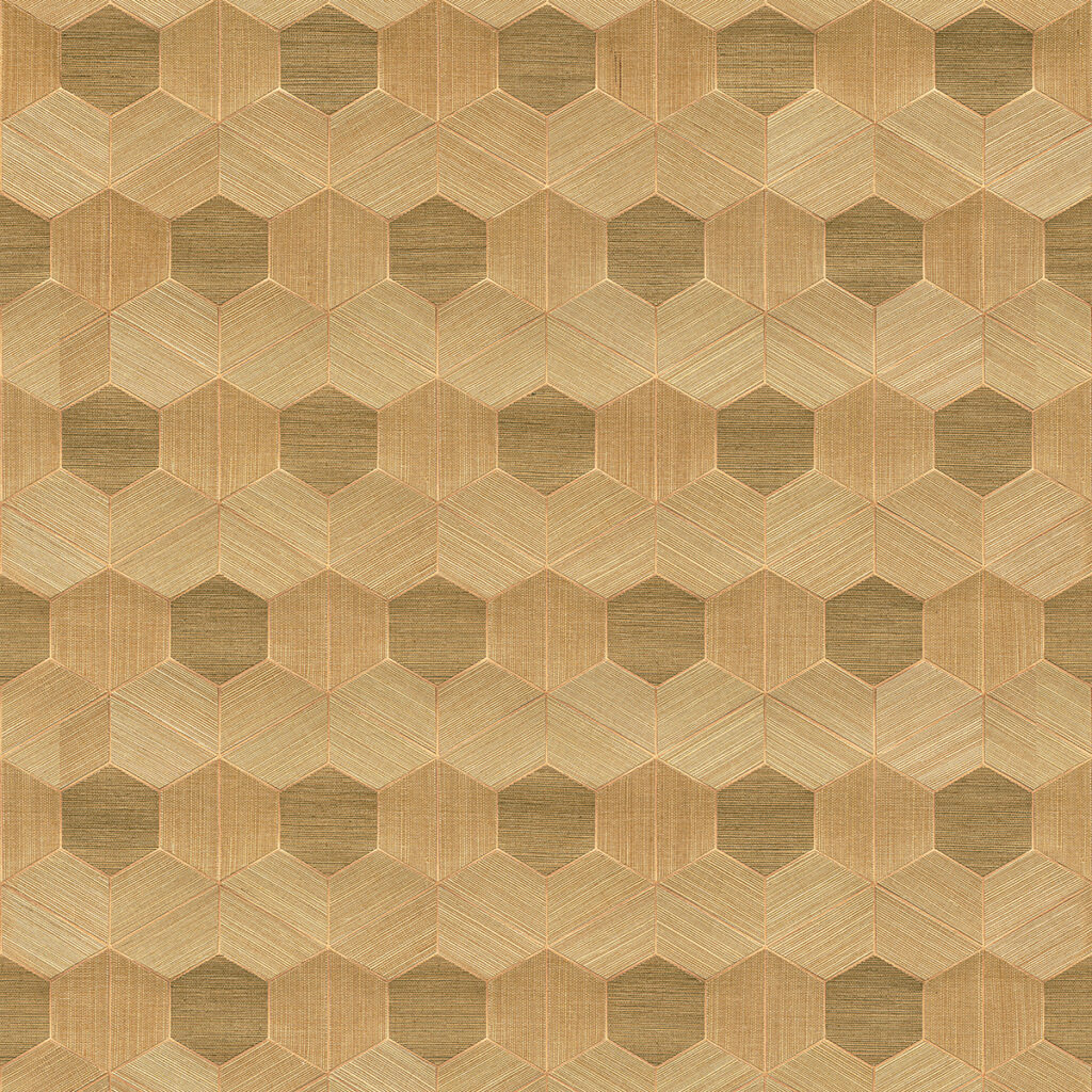 Grasscloth has been reimaged with this dynamic geometric design. Thin bronze and golden grasses have been woven onto a copper backdrop, then cut and reassembled into a compelling honeycomb pattern along another copper background. Linzhi is an unpasted, sisal grasscloth inlay wallpaper.