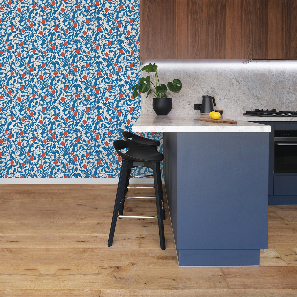A twist of a classic theme, this eclectic fruit wallpaper will add a bright splash of character to your space. Red citrus hangs from branches shaped by the interplay of bright blue color blocking and white negative space. Loretto is an unpasted, non woven wallpaper.