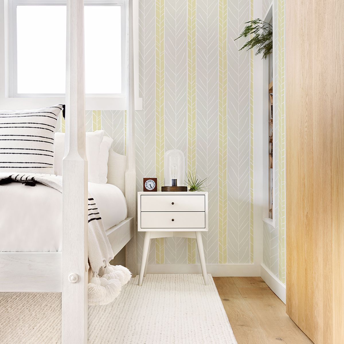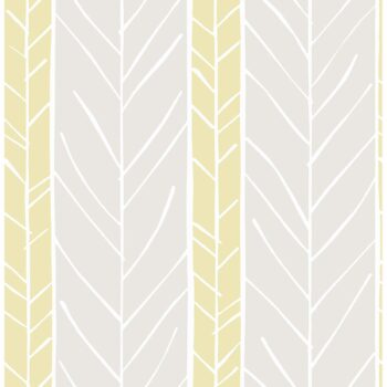 Stripes with white geometric accents make up this eclectic wallpaper. Its palette of light yellow and grey hues will add a softness to rooms. Lottie is an unpasted, non woven wallpaper.