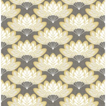 Mustard fans with floral motifs pop against a grey linen inspired background. This dimensional design will add a whimsical flair to rooms. Lotus is an unpasted, non woven wallpaper.