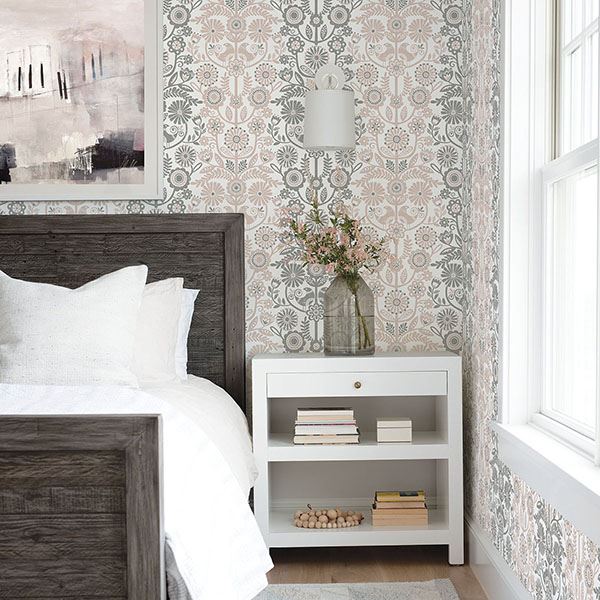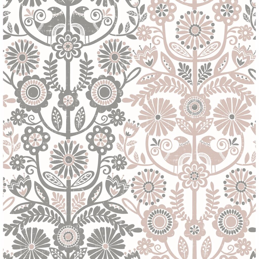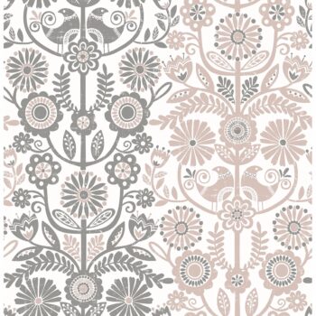 Bird and floral motifs pay homage to the folk roots of Scandinavian style in this symmetrical striped design. Its soft rose and taupe hues are accented by distressed details, creating a sweet wallpaper perfect for nurseries. Lovebirds is an unpasted, non woven wallpaper.
