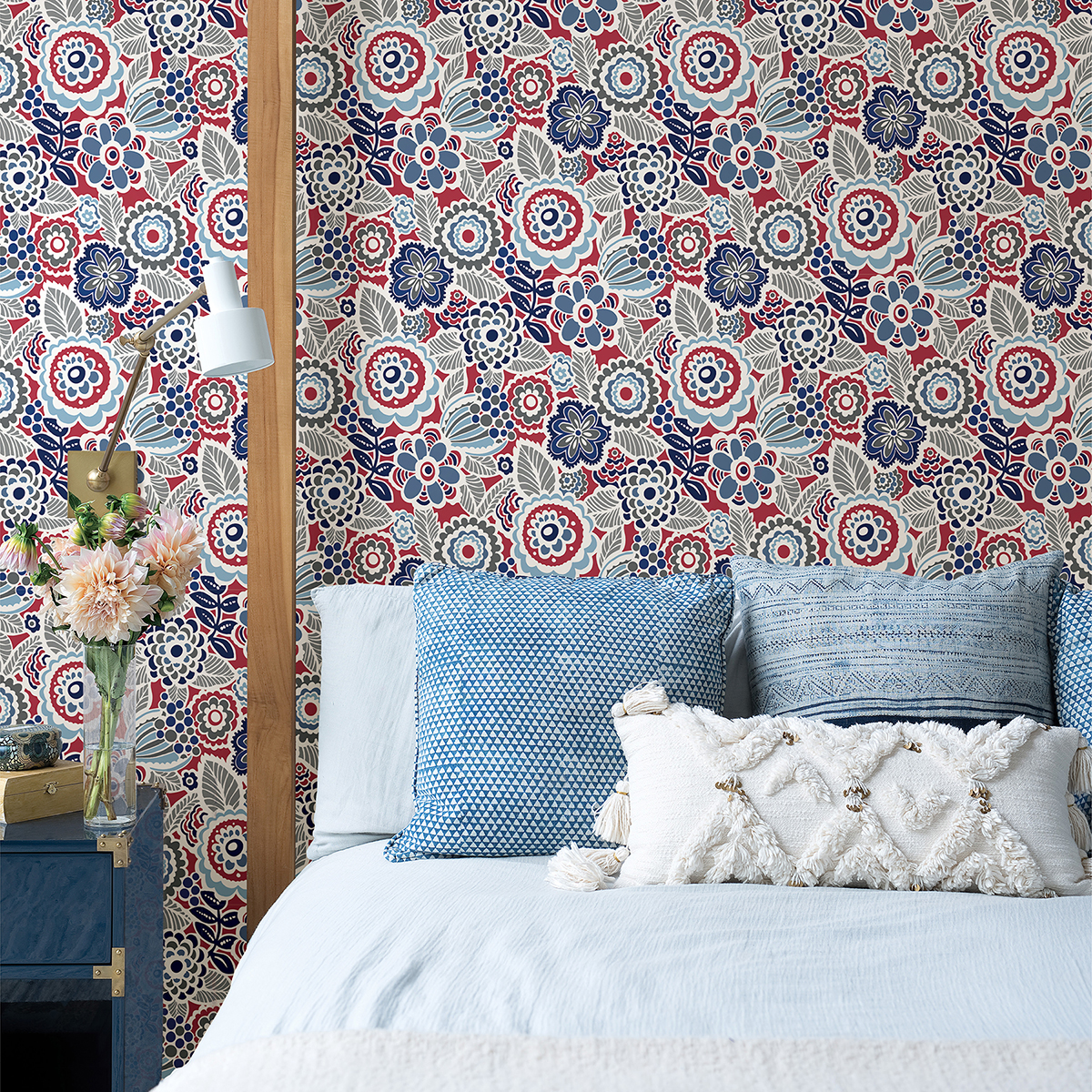 Add a splash of color to walls with this retro floral wallpaper. Gorgeous blossoms in an array of red, blue and grey hues have an energetic charm. Lucy is an unpasted, non woven wallpaper.