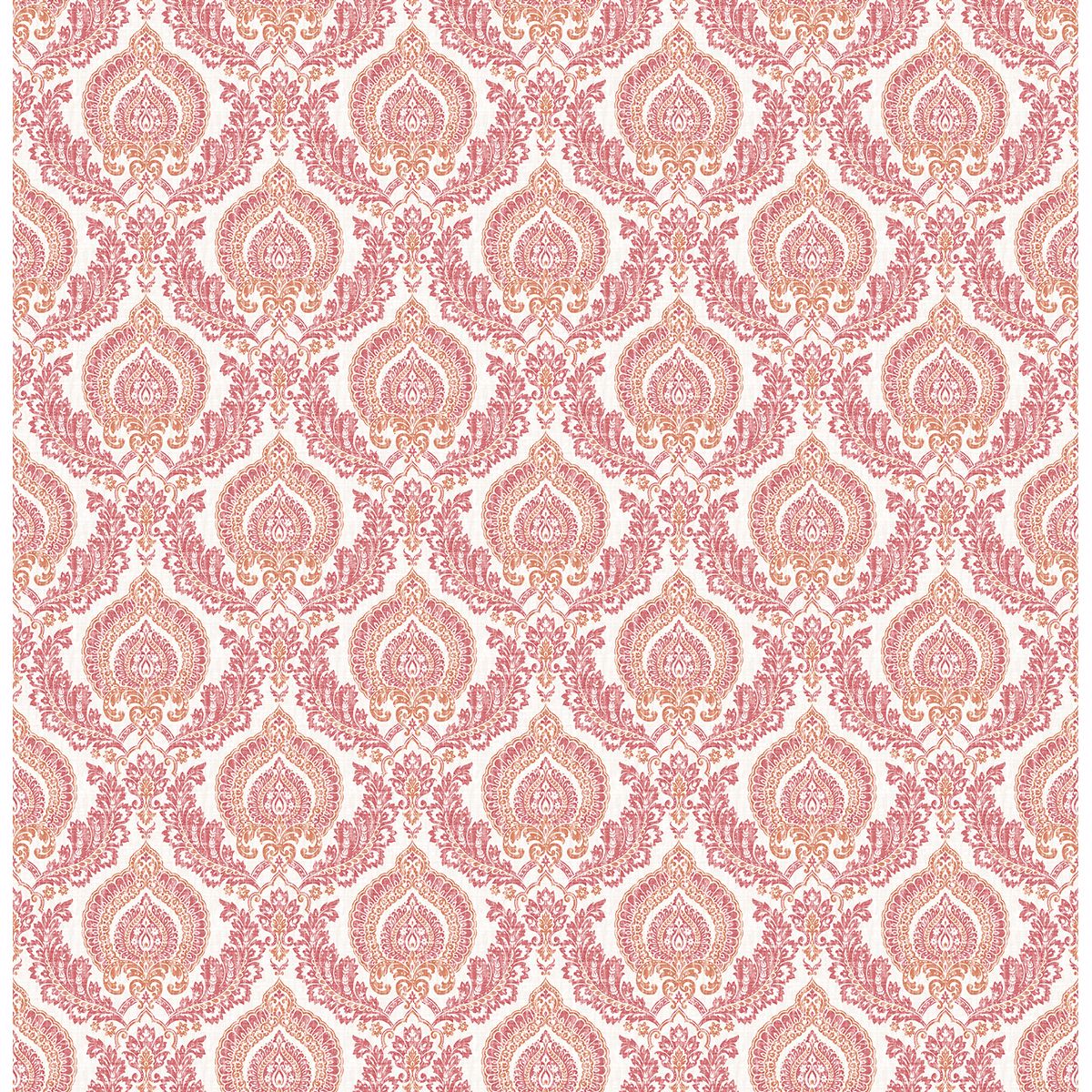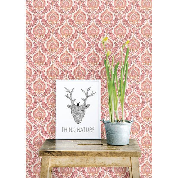This small scale damask wallpaper comes to life in shades of rose pink and tangerine. Bright yet subdued, these colors are the perfect combination to highlight the intricate details of this design.