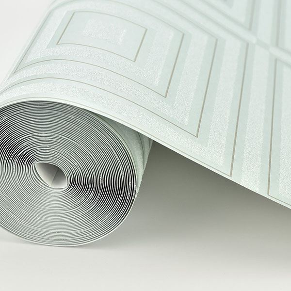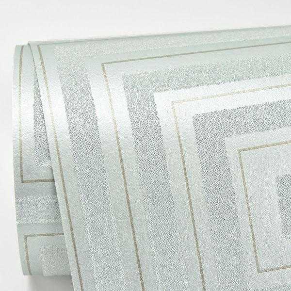 Lines of beads form a luxurious texture on this wallpaper. Faint gold squares alternate with the beadwork over a pearlescent ice blue background. Luminous is a non woven, unpasted wallpaper.
