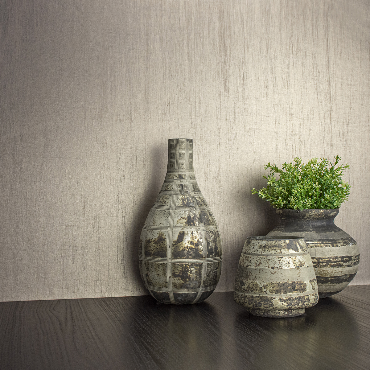 Adorn your walls with this luxurious metallic taupe wallpaper. Its distressed foil design lends to its silk weave inspired look. Lustre is an unpasted, non woven wallpaper.