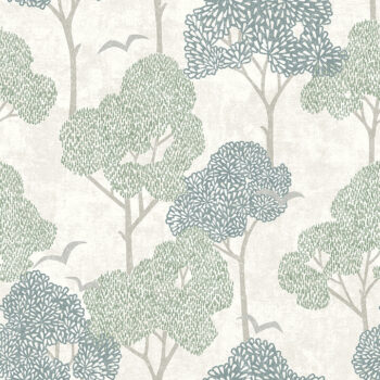Stately and serene, this stylized tree wallpaper will add an element of tranquil refinement to your walls. The artistically drawn forest sports sage and steely blue abstracted foliage, the negative space given extra depth with a distressed off-white background. Lykke is an unpasted, non woven wallpaper.