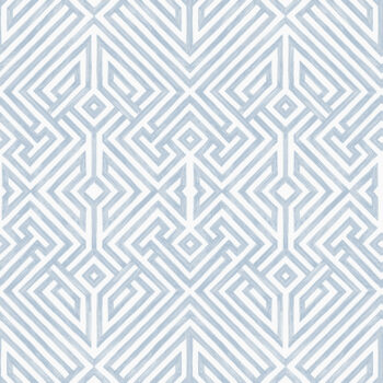 Timeless blue and white meets a contemporary take on geometric key design. The complex pattern is colored in shades of light blue against crisp white. Lyon is an unpasted, non woven wallpaper.