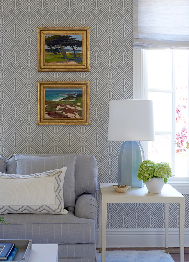 This wallpaper gives timeless geometric key design a chic, contemporary twist. The complex geometrics are inked in a blend of cool greys along a crisp white background. Lyon is an unpasted, non woven wallpaper.