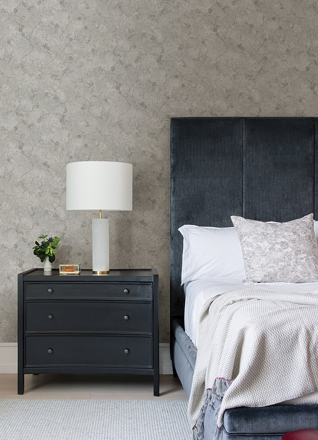 For interiors filled with timeless, feminine sophistication, choose this floral vine wallpaper. The grey backdrop is detailed with a plaster-like texture, while the spindly vines are silhouetted in a dark metallic silver. Mahina is an unpasted, non woven wallpaper.
