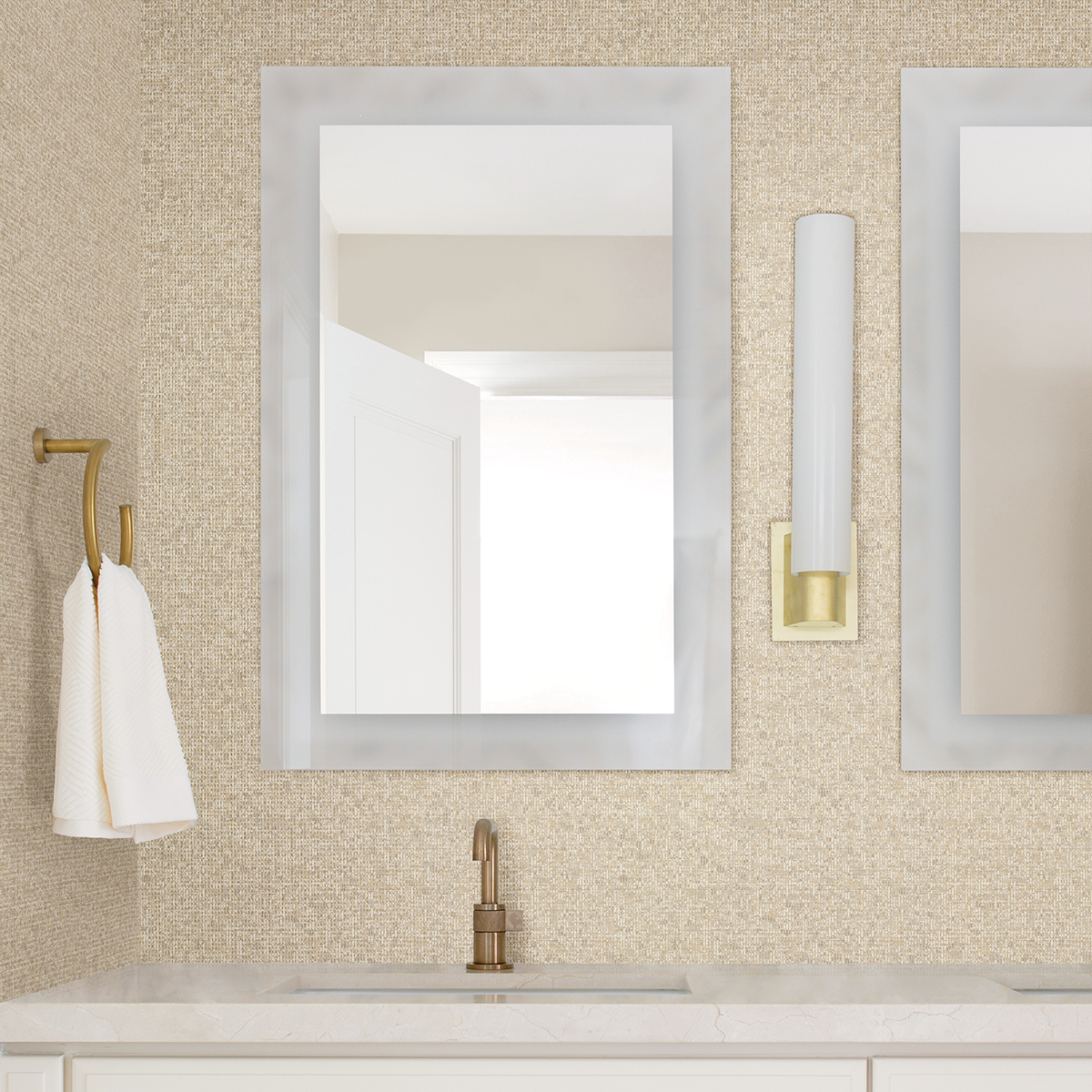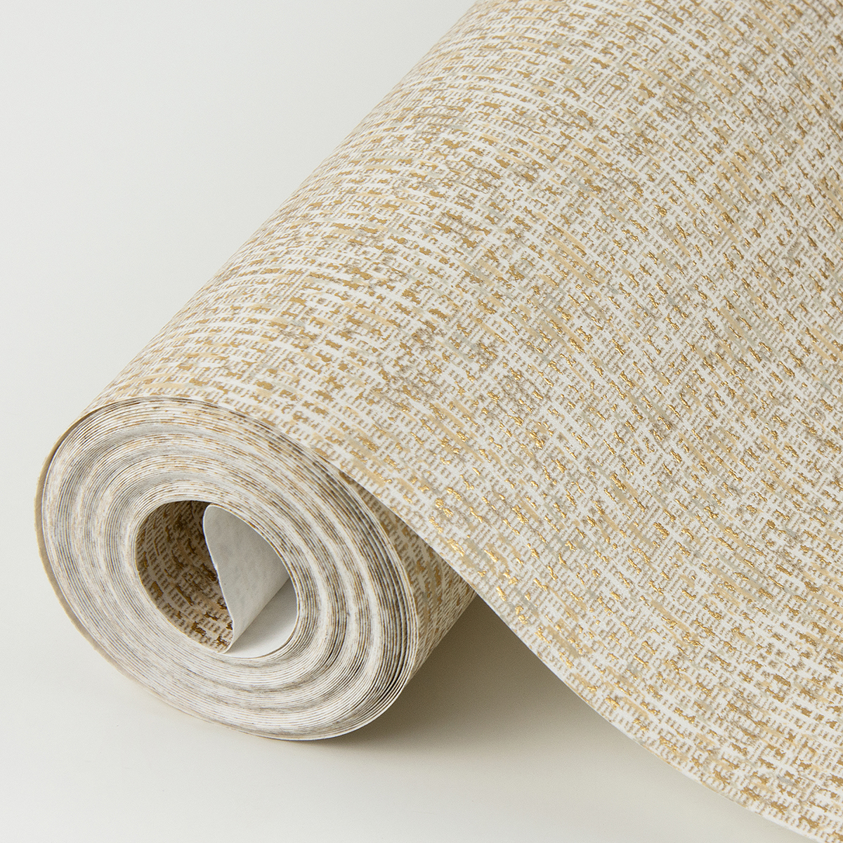 A classic design is given a glamorous makeover in this textural wallpaper! The linen-like blend of white, taupe and honey is given a high-impact finish with a metallic golden weave of raised inks. Maia is an unpasted, foil on non woven wallpaper.