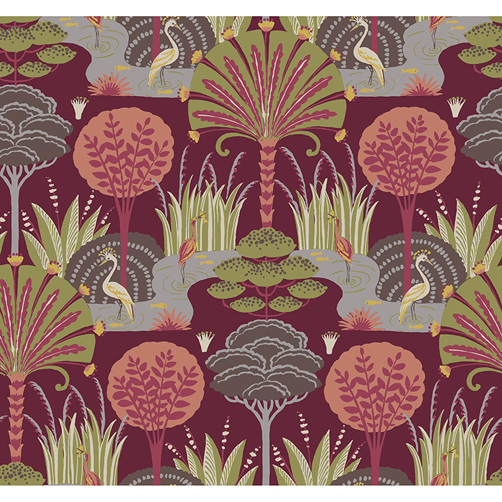 This gorgeous tropical design brings rich color and character to your walls. A lush oasis with winding, crane-filled pond shaded by stylized trees is colored in a vibrant array of salmon, green, pale blue, yellow, cream, and raspberry. Mandeville is an unpasted, non woven wallpaper measuring 27 inches wide by 27 feet long, covering approxiamately About 60.8 square feet square feet per roll