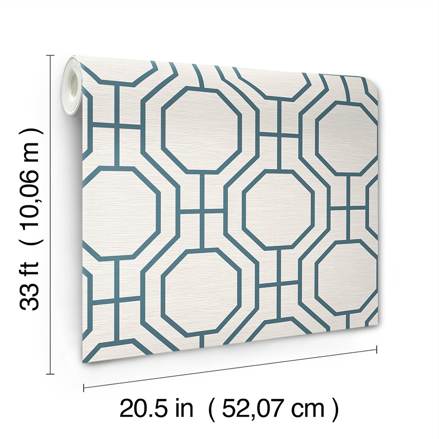 Trellis detailing is given a modern overhaul with this chic wallpaper. The octagonal gridwork is inked in deep teal against a white faux grasscloth backdrop imbued with tactile, textural detailing. Manor is an unpasted, non woven wallpaper measuring 20.5 inches wide by 33 feet long, covering approximately 56.4 square feet per roll.