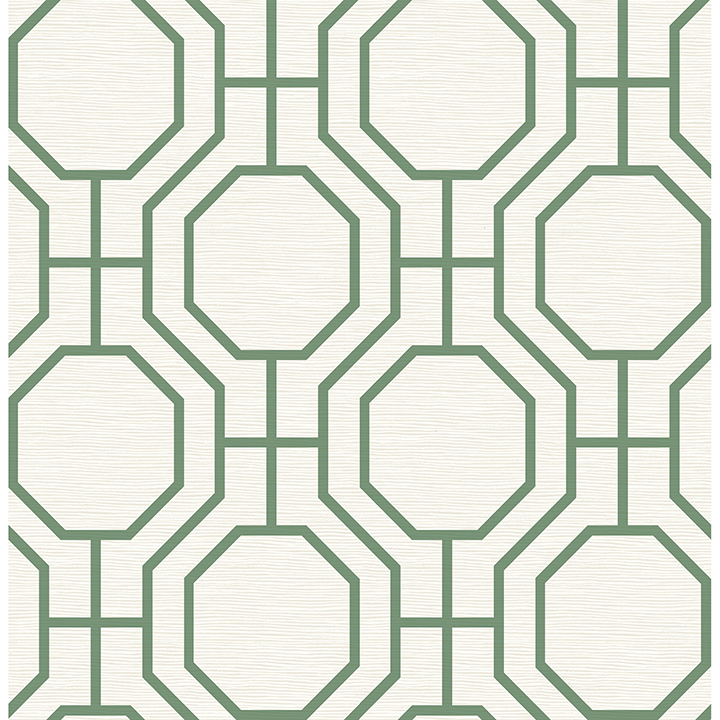 Enjoy a modern revitalization of trellis design with this wallpaper. The vibrant green gridwork features octagonal detailing, offset by a cream faux grasscloth background with tactile finishes. Manor is an unpasted, non woven wallpaper measuring 20.5 inches wide by 33 feet long, covering approximately 56.4 square feet per roll.