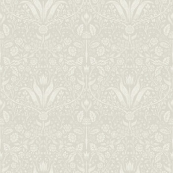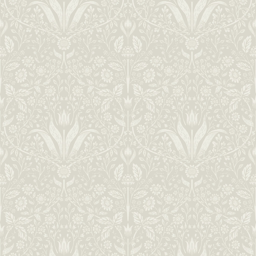 This charming ogee wallpaper celebrates the first blossoms of spring! Tulips, daises, and other early blooms are delicately inked in antique white against a light grey backdrop. Mara is an unpasted, non woven wallpaper measuring 20.9 inches wide by 33 feet long, covering approxiamately About 57.5 square feet square feet per roll
