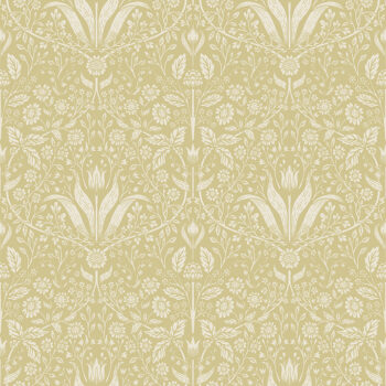 This floral wallpaper heralds the new, verdant life of spring. Tulips and daises are the basis of a delicate ogee pattern, inked in white against golden ochre. Mara is an unpasted, non woven wallpaper measuring 20.9 inches wide by 33 feet long, covering approxiamately About 57.5 square feet square feet per roll