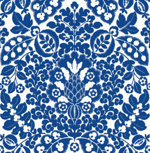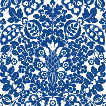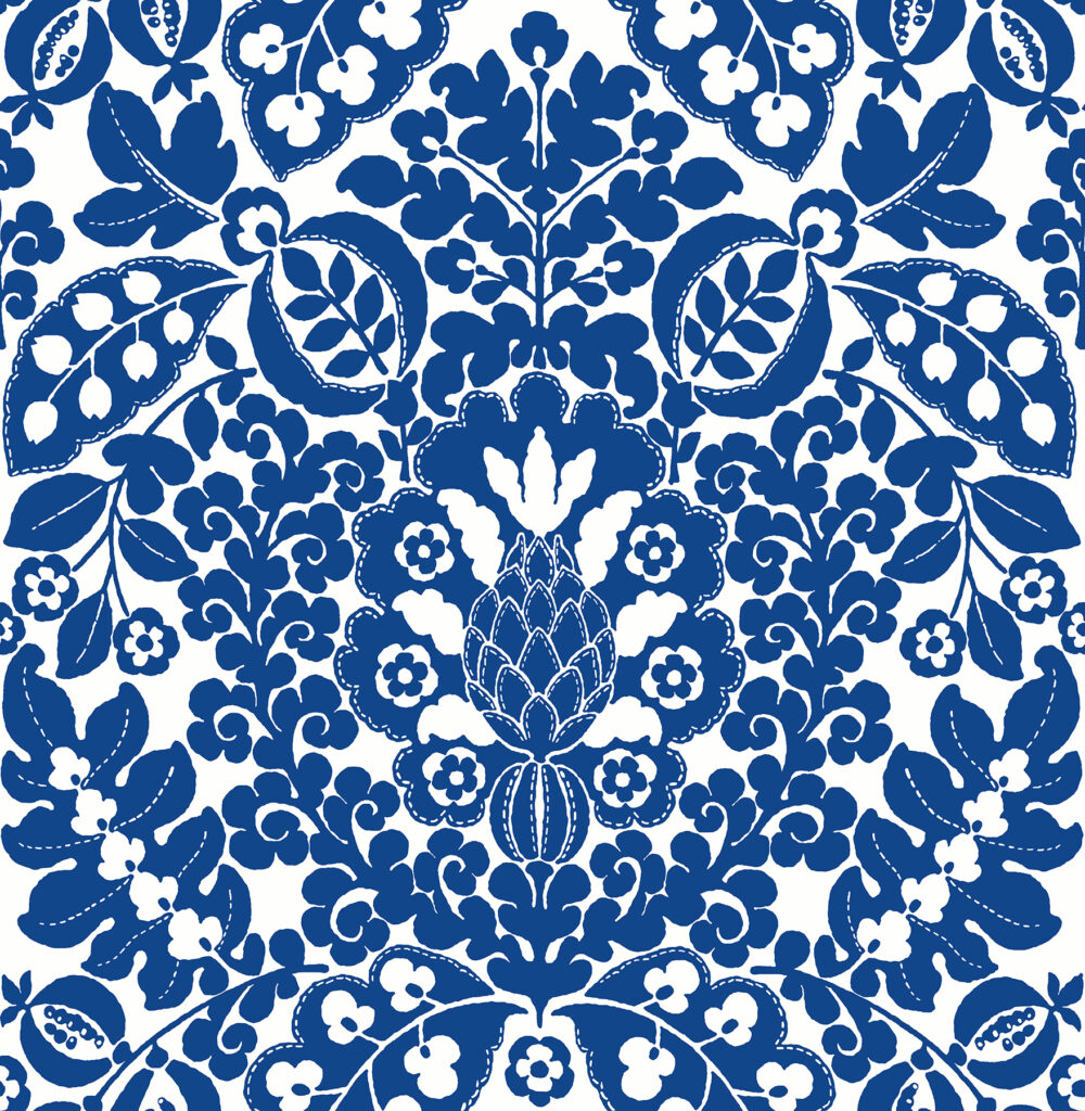 Make a bold yet whimsical statement in your home with this charming damask wallpaper. The large-scale design features an array of fruit, floral, and leafy silhouettes stamped in rich blue against a white backdrop. Marni is an unpasted, non woven wallpaper.