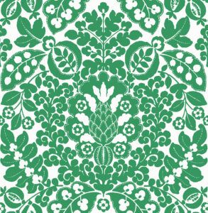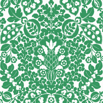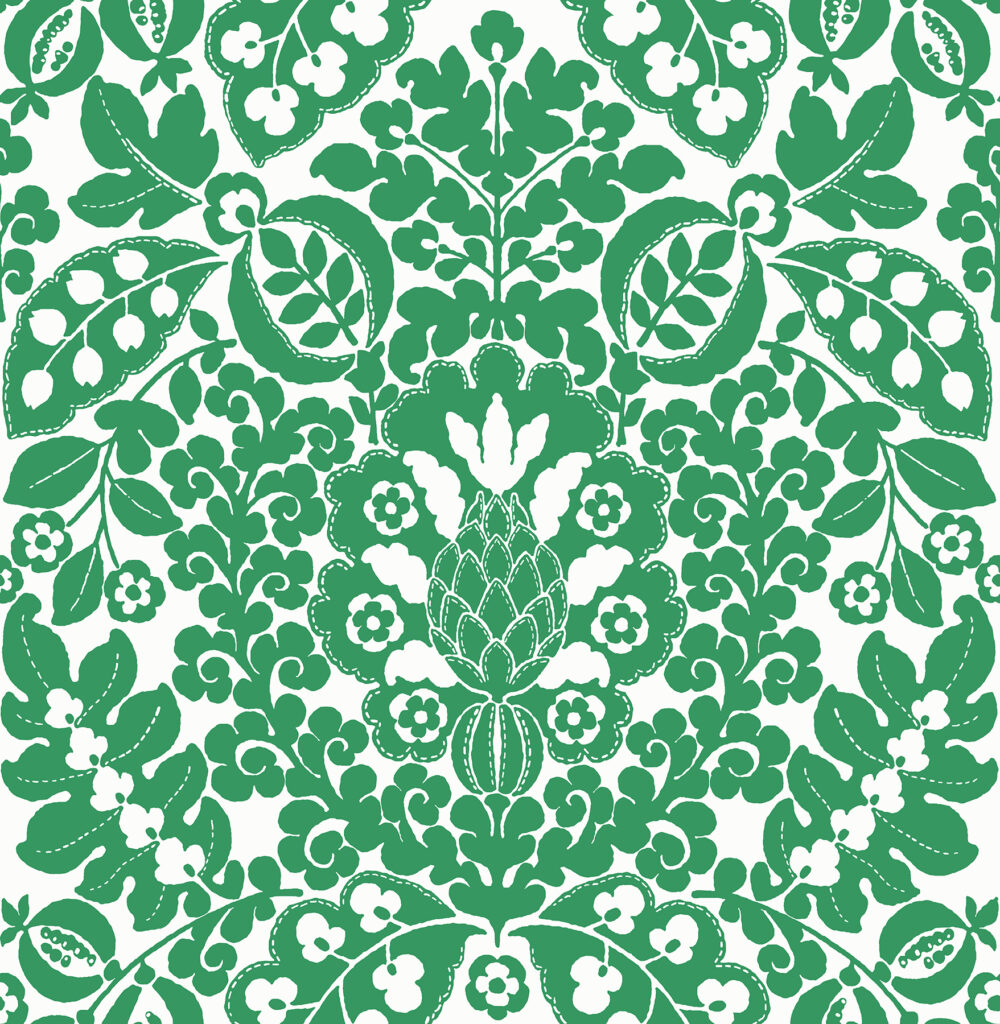 This whimsical, large-scale damask will bring a bold pop of color and pattern to your walls. An array of fruit, floral, and leafy silhouettes are inked in a pigmented green against a white backdrop. Marni is an unpasted, non woven wallpaper.