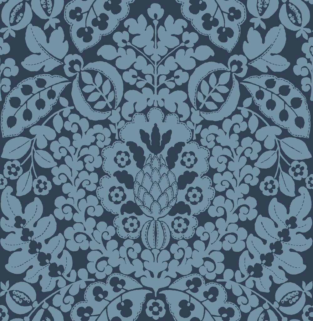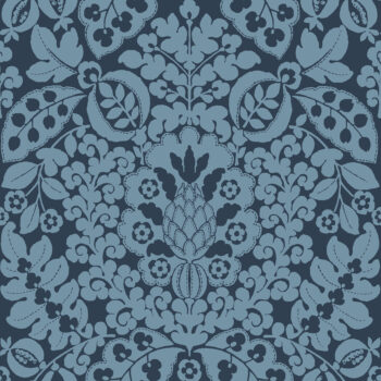 This bold damask wallpaper will bring a touch of whimsy to your interiors. The large-scale design features fruit, flower, and leafy silhouettes inked in soft teal against a navy-blue background. Marni is an unpasted, non woven wallpaper.