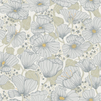 Add sweet sophistication to your home with this charming, Arts & Crafts-inspired floral design. Large poppies are colored powder blue with grey leafy stems, the blooms surrounded by petite, star-shaped blue flowers. Matilda is an unpasted, non woven wallpaper.