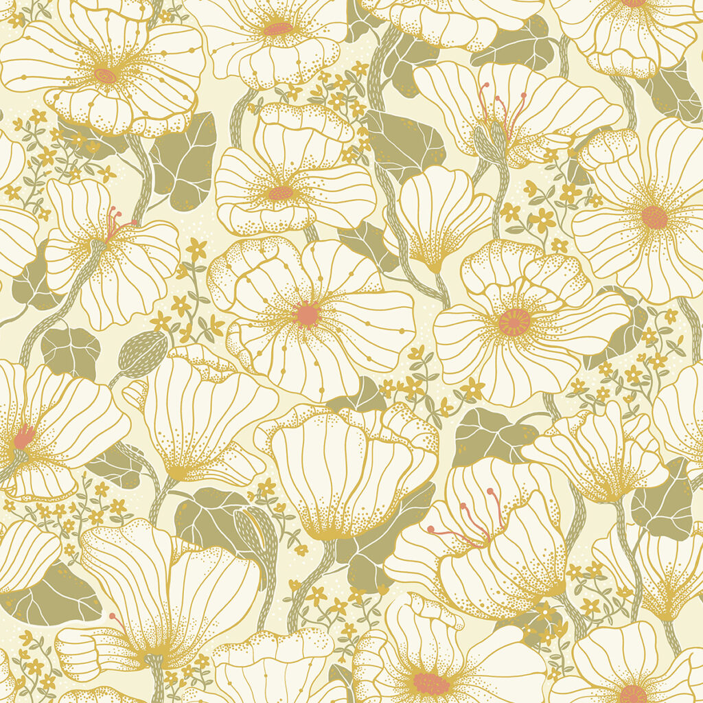 Enjoy a modern take on Arts & Crafts style with this gorgeous floral wallpaper! White poppies outlined in golden ochre inks twine together on olive green stems against a taupe backdrop. Matilda is an unpasted, non woven wallpaper.