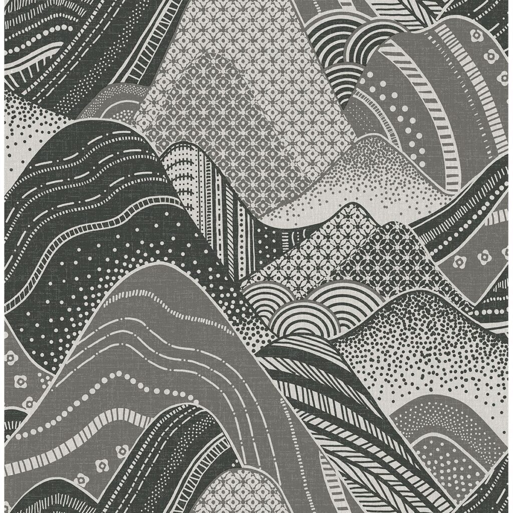 The influence of traditional Japanese art is apparent in style and ink like color palette of this wallpaper. Grey and black pattern-filled mountains are softened with a print of woven textures. Meru is a unpasted, non woven wallpaper.