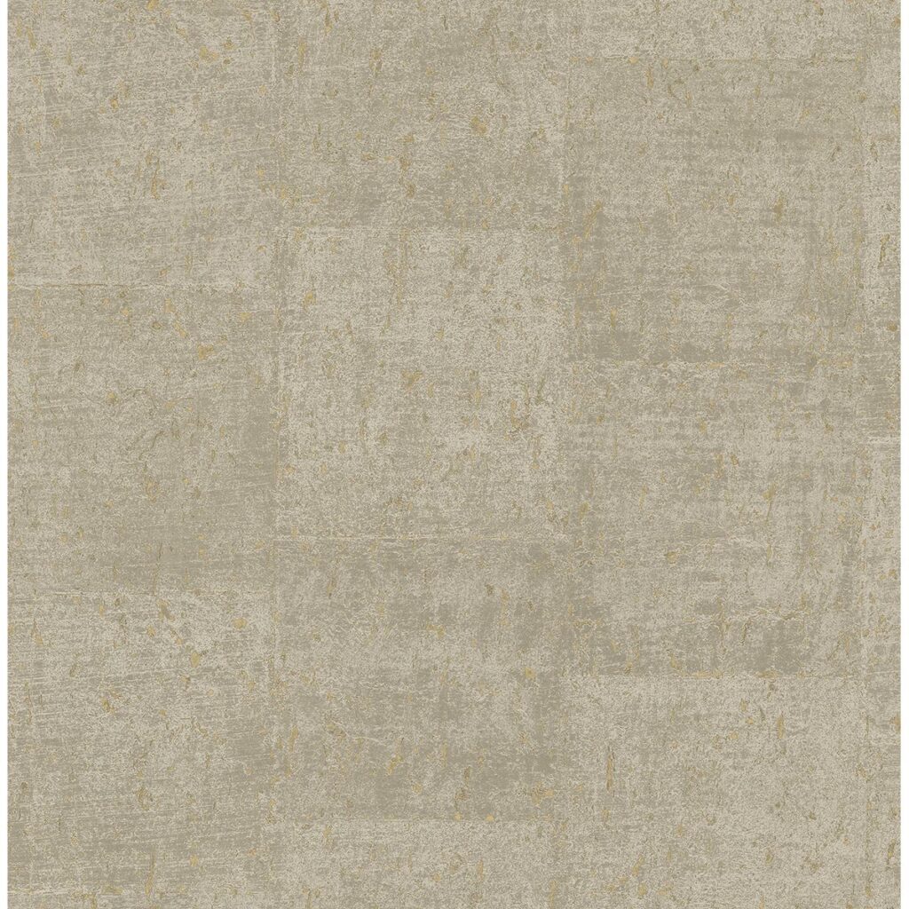 With a textured, subtle block pattern, this faux concrete wallpaper has a dimensional look. Its mottled design is accented by shimmering gold details. Millau is an unpasted, non woven wallpaper.