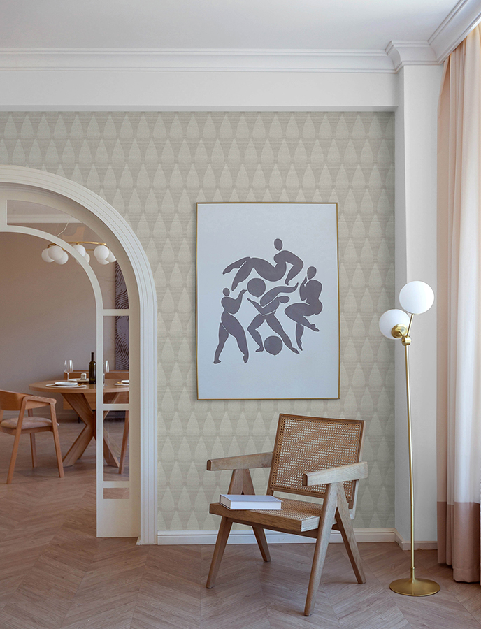 This sleek and modern ogee wallpaper features teardrop scales, cool grey tones, and textural striping. Mirko is an unpasted, non woven wallpaper measuring 20.5 inches wide by 33 feet long, covering approximately 56.4 square feet per roll.