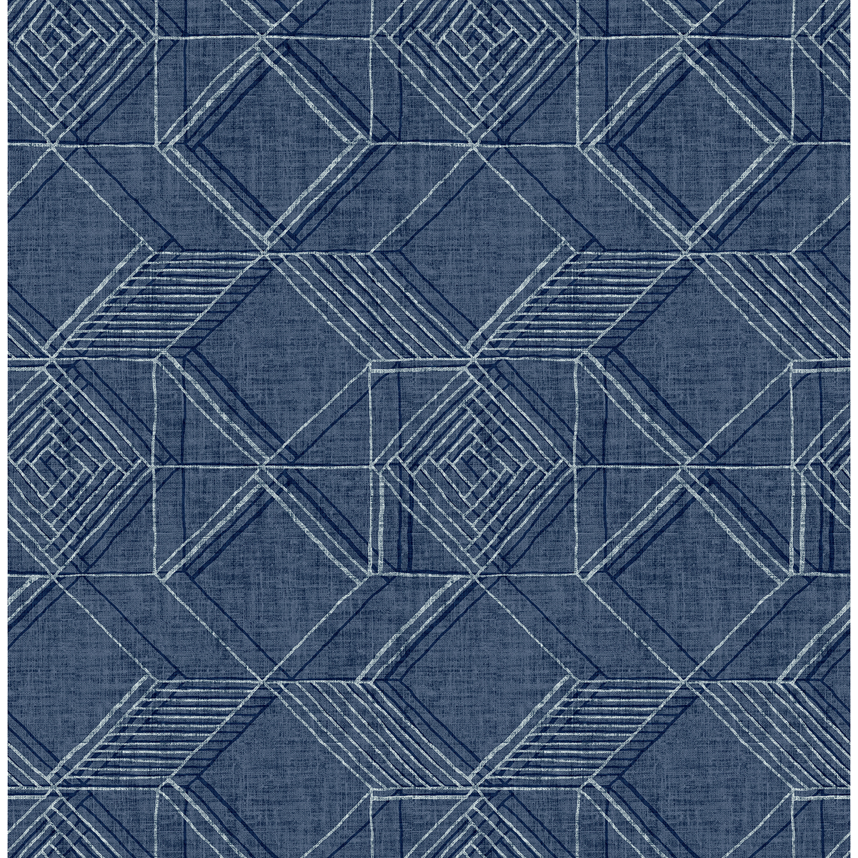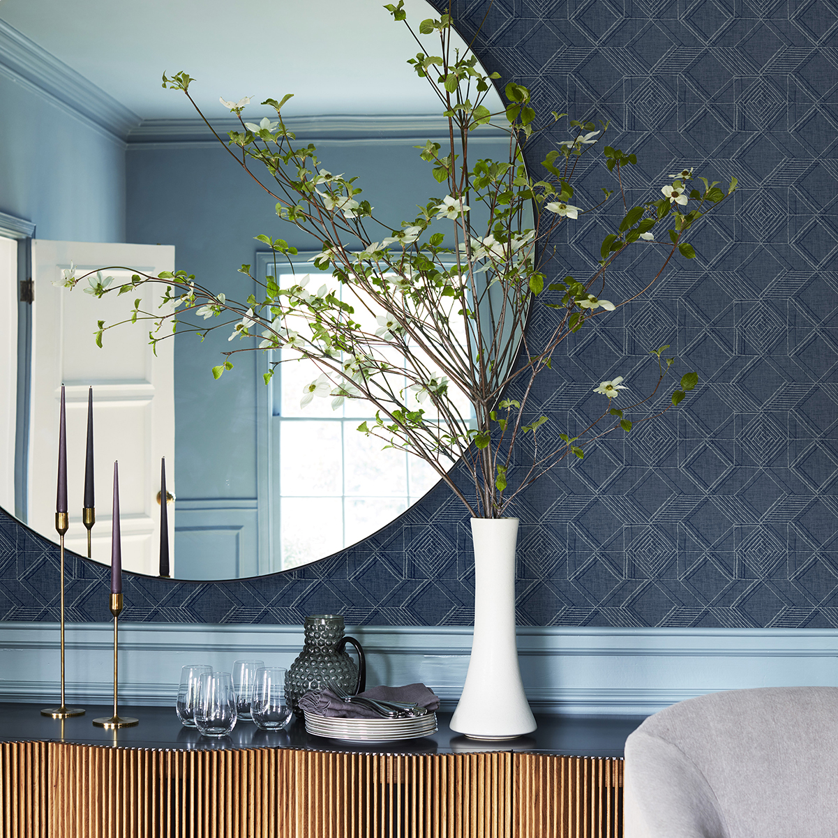 Add dimension to your walls with this modern geometric wallpaper. Set against a deep blue faux linen backdrop, the intricate latticework is detailed in white and duplicated in purple, both in raised inks. Moki is an unpasted, non woven wallpaper.