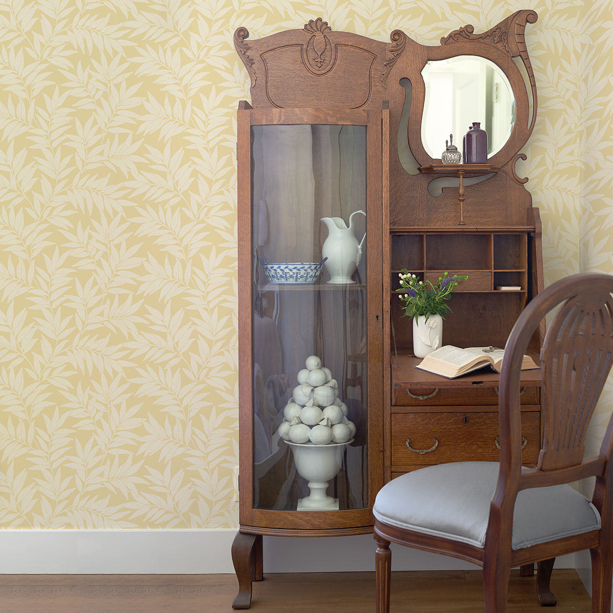 Add buttery warmth and tranquil woodland ambiance to your home with this gorgeous botanical wallpaper. Light grey ferns, accented with raised ink detailing, sway against the soft yellow background. Morris is an unpasted, non woven wallpaper.