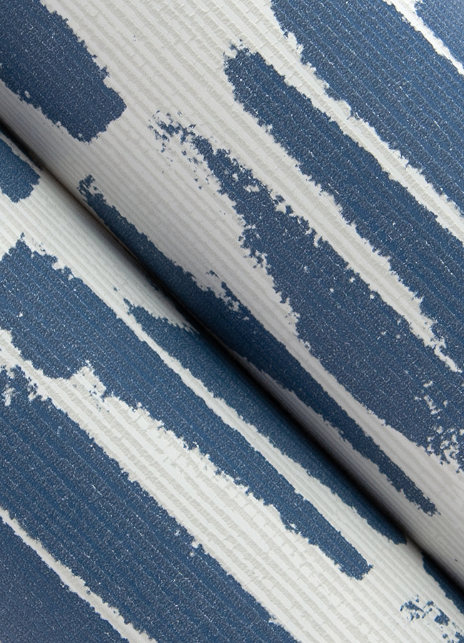 Bursting with energy, this compelling abstract geometric wallpaper will bring movement and dimension to your space. The free-form indigo brushstrokes form columns along a white backdrop, the entire surface elevated with lines of textured, raised inks. Myrtle is an unpasted, non woven wallpaper.