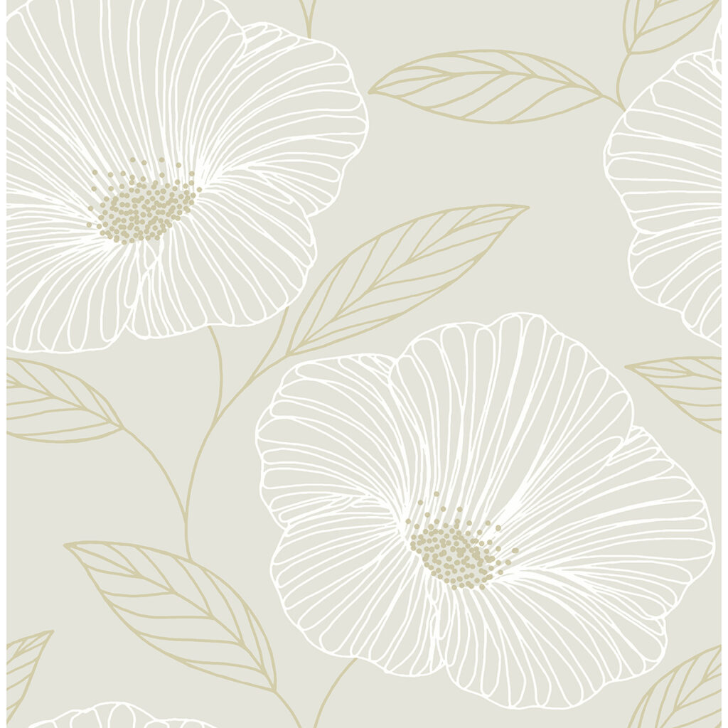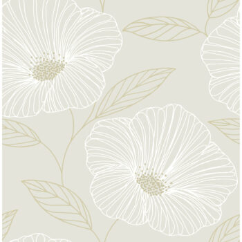 This modern large-scale floral design brings airy elegance to your home. Set against a warm taupe backdrop, the petals are shaped by thick white lines while the stem and flower centers are inked in metallic gold. Mythic is an unpasted, acrylic coated wallpaper.