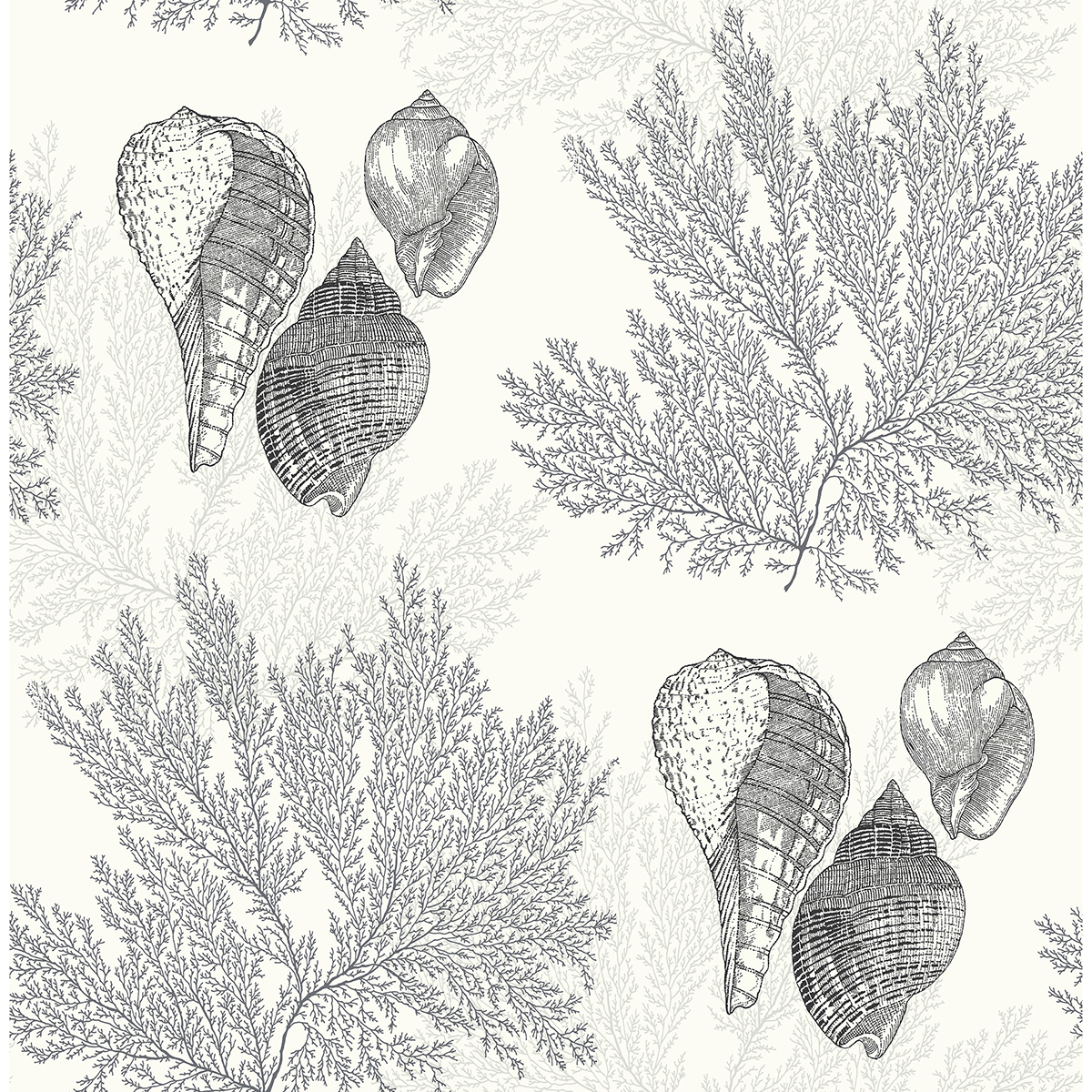 This modern take on traditional coastal design brings a sophisticated beach vibe to your space. The off-white background is layered with lacy coral and spiraled seashells inked in shades of grey and black. Nauset is an unpasted, gravure acrylic coated wallpaper.