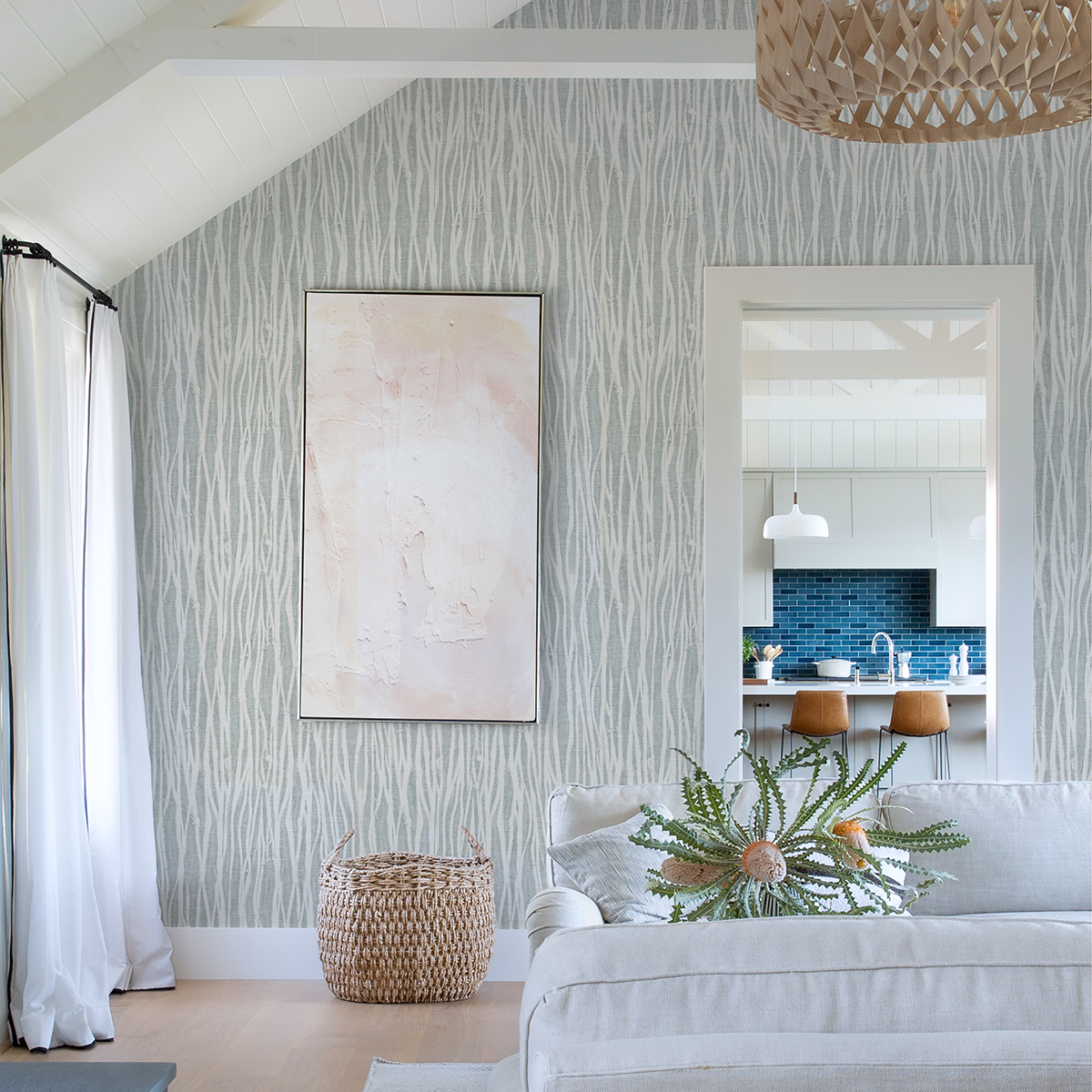 This contemporary striped design adds a soothing and organic element to your décor. The wavering columns are offset against a blended grey backdrop and enhanced by raised ink detailing. Nazar is an unpasted, non woven wallpaper.