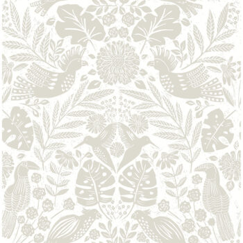 Bird lovers, rejoice! This playful damask wallpaper features a diverse tropical flock roosted amongst lush foliage, the details block printed in light grey against white. Nestle is an unpasted, non woven wallpaper measuring 20.5 inches wide by 33 feet long, covering approximately 56.4 square feet per roll.
