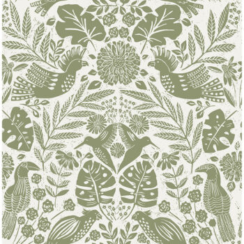 Birds of a feather flock together in this whimsical damask wallpaper. Hummingbirds, toucans, parrots, and cockatoos all roost within lush tropical flora, the details blocked pinked in olive green against cream. Nestle is an unpasted, non woven wallpaper measuring 20.5 inches wide by 33 feet long, covering approximately 56.4 square feet per roll.