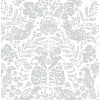The perfect design for bird-lovers. This damask wallpaper features toucans, hummingbirds, parrots, and cockatoos roosting within tropical flora, the details whimsically block printed in cool grey. Nestle is an unpasted, non woven wallpaper measuring 20.5 inches wide by 33 feet long, covering approximately 56.4 square feet per roll.
