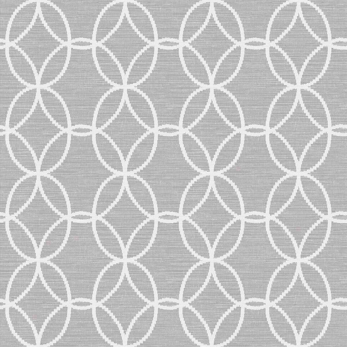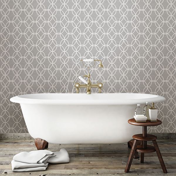 This dove grey wallpaper has a modern oblong link print and a grasscloth texture background. The white print creates a chic contrast and maintains the neutral color scheme.