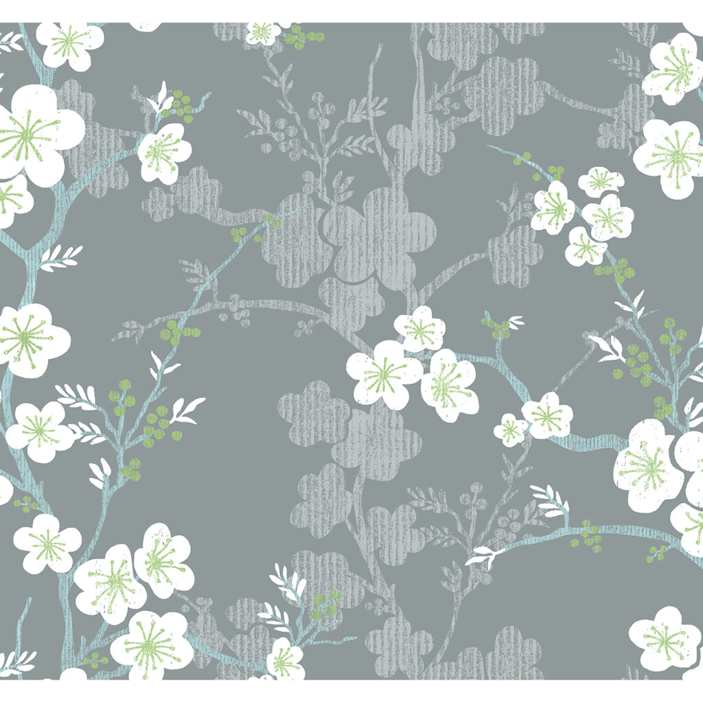 Elevate your walls with the chic chinoiserie flair of this modern floral wallpaper. Blue branches dotted with white blossoms wind upwards, silhouetted by light grey doubles against a cool grey backdrop. Nicolette is an unpasted, acrylic coated wallpaper.