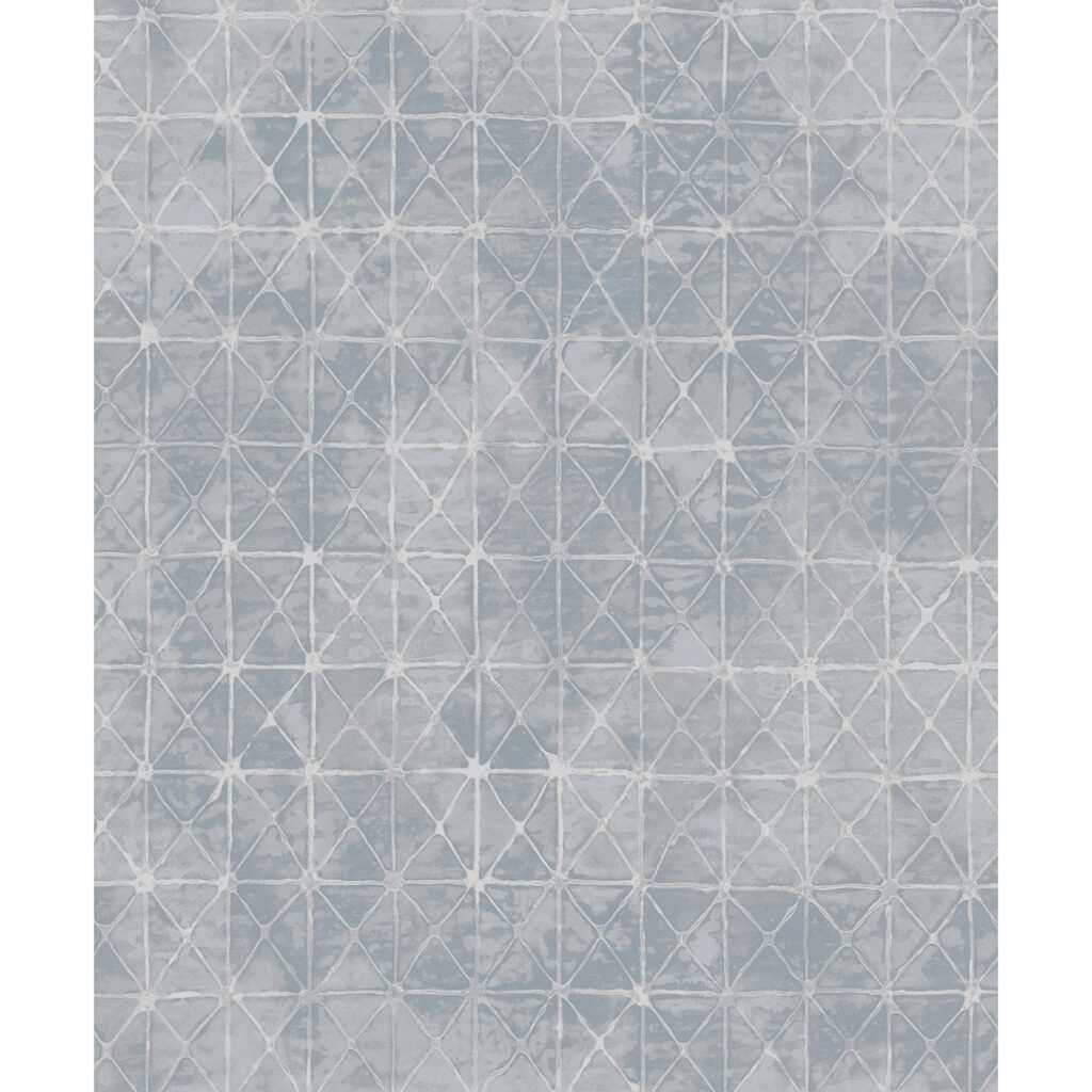 Add instant charm to your home with this antique tile wallpaper. The Old World style is given a modern touch, the triangular segments a blend of silverly blue and light grey accented by off-white grout lines brushed with silver. Odell is an unpasted, non woven backed vinyl wallpaper.