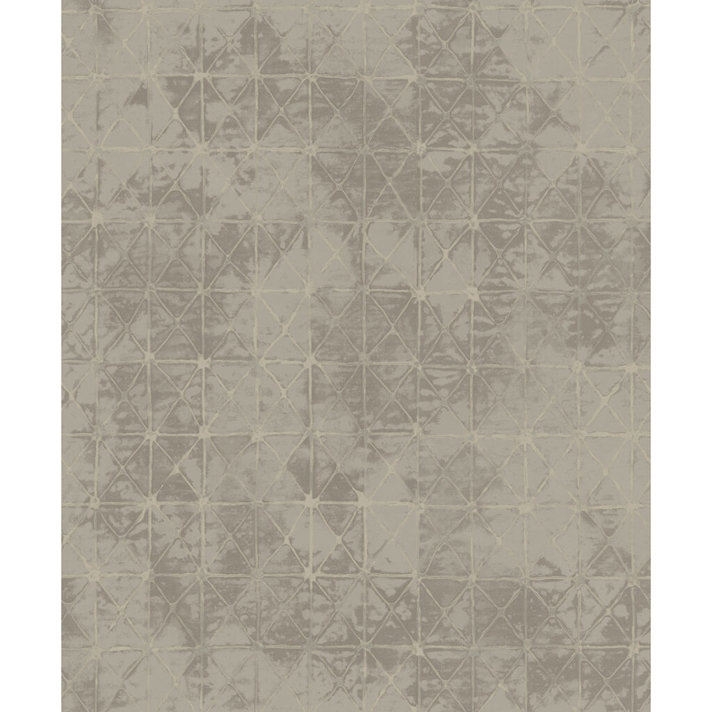 Bring Old World elegance to your walls with this geometric design! The triangular tiles form a simple mosaic of golden greys, the distressed areas both raised and finished with a silken sheen. Odell is an unpasted, non woven backed vinyl wallpaper.