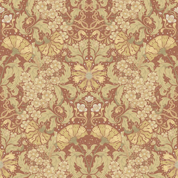 This lush and romantic floral wallpaper will elevate your walls with its feminine sophistication! The ornate, Art Nouveau design features golden, fan-like flowers framed by large leaves and a waving column petite, white blooms. The rust-red backdrop adds an extra layer of luxury to its intricate styling. Ojvind is an unpasted, non woven wallpaper.